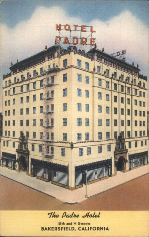 The Padre Hotel, located at 18th and H Streets, is described as Bakersfield's Newest and Largest Downtown Hotel, situated in the heart of the Theatre and Shopping District.