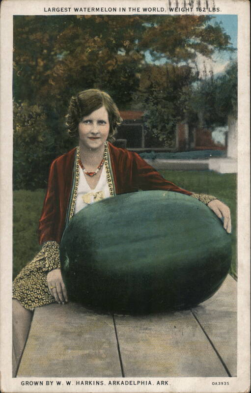 A woman in a red jacket and patterned skirt poses with a massive 162-pound watermelon on a wooden table. Trees and a house are visible in the background.