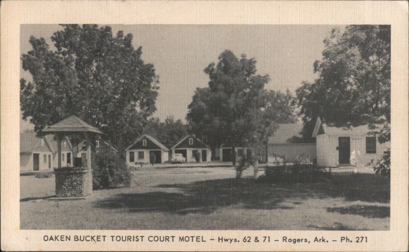 The postcard depicts the Oaken Bucket Tourist Court Motel, featuring multiple small cabin-style buildings and a prominent well with a bucket in the foreground, set among trees.