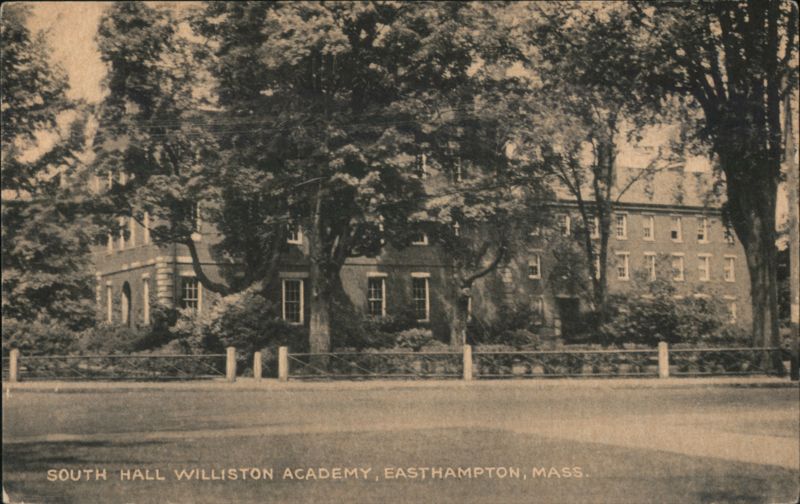 View of the large, multi-story academic building, partially obscured by lush trees, with a low fence running along the foreground.