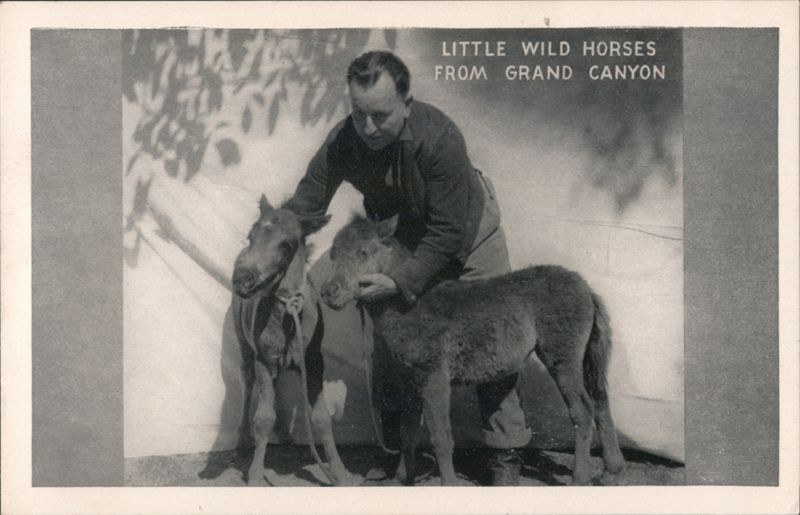 A man standing with two young horses, likely foals, in a studio-like setting with a painted background, identified as 'Little Wild Horses from Grand Canyon'.