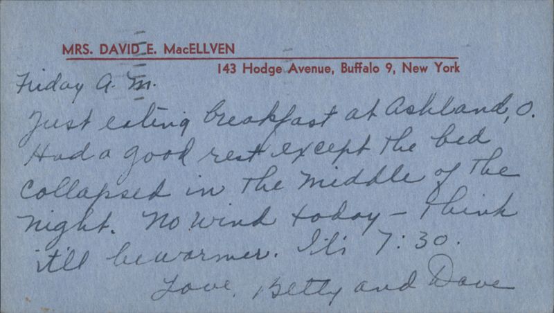 A handwritten message from Betty and Dave, sent from Ashland, Ohio, detailing their travel experiences including breakfast and a humorous incident involving a collapsed bed. Sent to Mrs. George E. Flynn in Buffalo, NY.