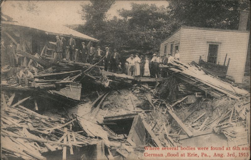 Devastation at 6th and German Streets in Erie, Pennsylvania, following the August 3, 1915 flood. Debris from collapsed structures is visible, with people standing amidst the rubble where several bodies were found.