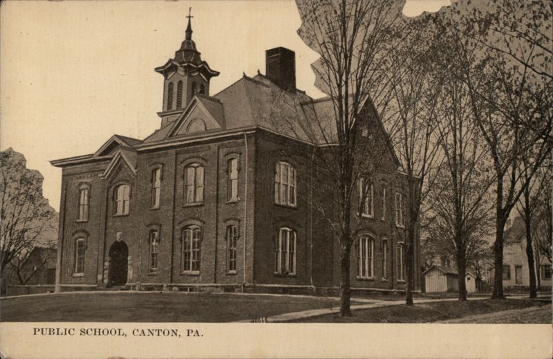 A large brick school building with a prominent central tower and multiple wings, set amidst a grassy area with trees. A figure stands near the building's entrance.