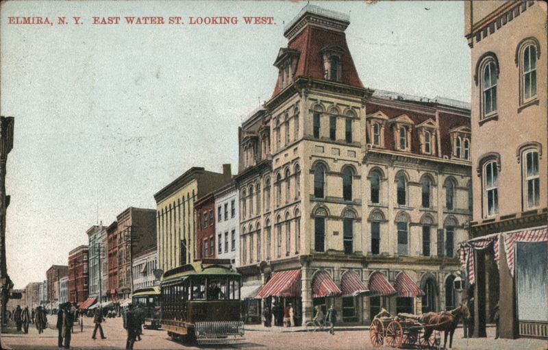 A bustling street scene featuring a large, ornate multi-story building with a mansard roof and a streetcar in the foreground. Other commercial buildings line the street.