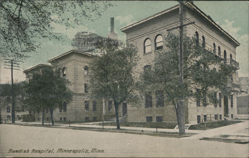 | View of the multi-story Swedish Hospital building, featuring arched windows and brick construction, surrounded by several mature trees. A utility pole stands prominently in the foreground on the right, with a street and sidewalk in front of the hospital. |