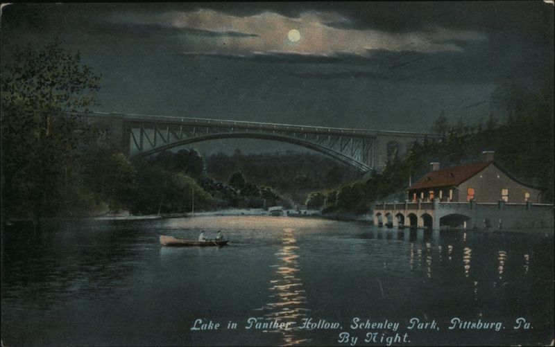 A moonlit scene of Panther Hollow Lake with a large arched bridge in the background, a building with arched windows on the right, and two figures in a rowboat.