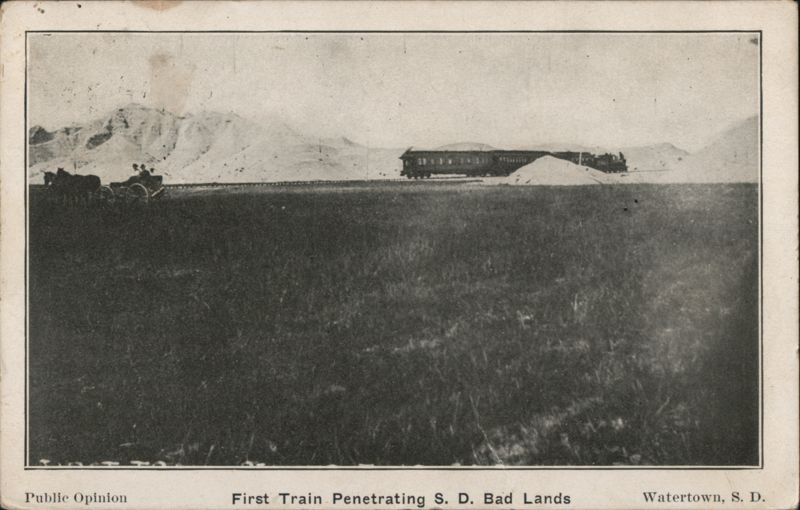 A train moves across a vast, grassy plain with distant badland formations. In the foreground, a horse-drawn buggy with two individuals is visible.
