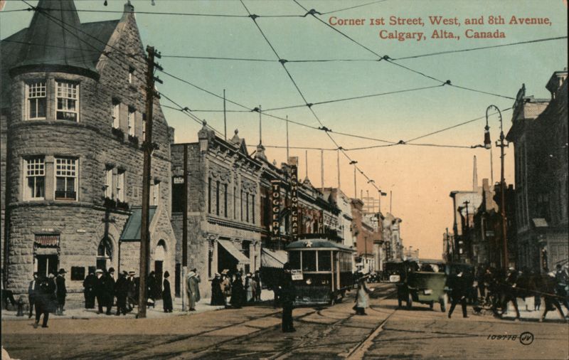 A bustling street scene at the corner of 1st Street West and 8th Avenue in Calgary. A streetcar is visible on tracks, along with horse-drawn vehicles and pedestrians. Prominent stone and brick buildings line the street.