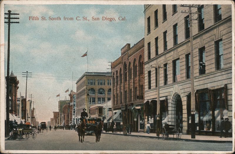 A bustling street scene with horse-drawn carriages and pedestrians. Multi-story commercial buildings line the right side, while utility poles and lines are prominent on the left.