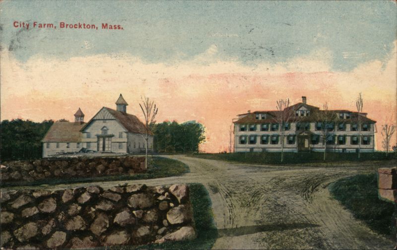 Two large buildings on a farm property, including a main institutional building and a barn-like structure, with a stone wall in the foreground.