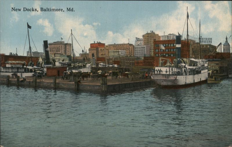 | A bustling waterfront scene depicting several ships, including steamships and sailboats, moored at a dock. Piers are lined with various goods and people, with a cityscape of multi-story buildings forming the background under a partly cloudy sky. |