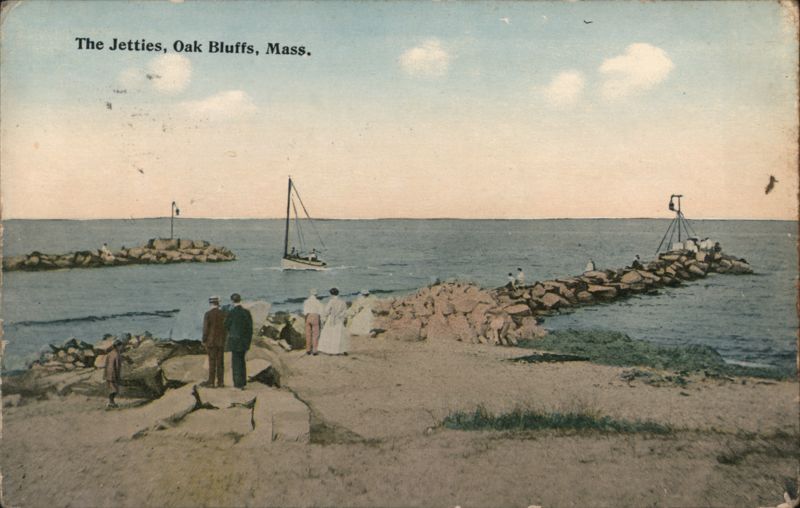 People on and around stone jetties extending into the ocean, with a sailboat in the distance.