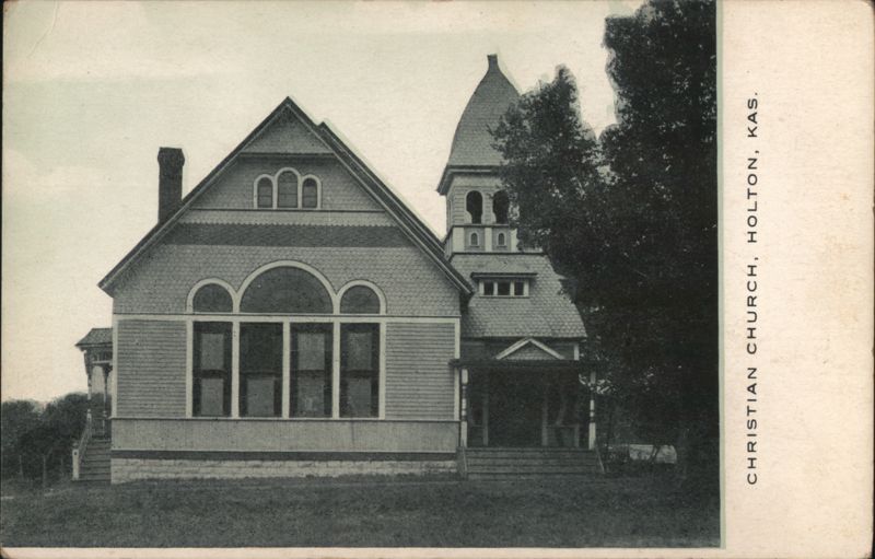 View of the Christian Church in Holton, featuring its gabled roof, tall chimney, and bell tower.