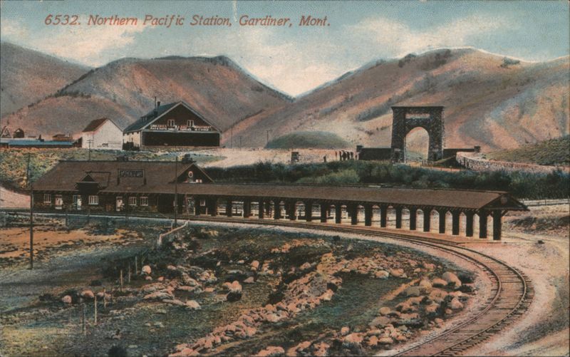 View of the Northern Pacific Station building with a long covered platform and railway tracks. In the background, the large stone archway of the Roosevelt Arch is visible, surrounded by mountains.