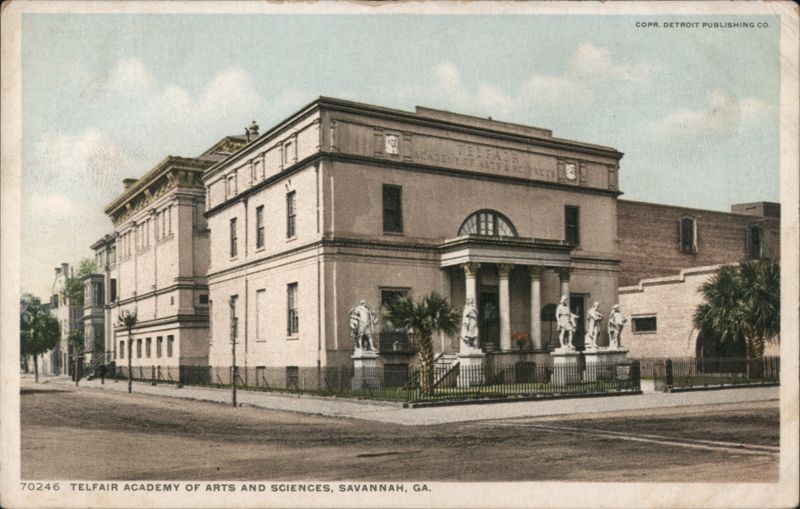 View of the Telfair Academy, a classical-style building with a grand entrance featuring columns and sculptures, surrounded by a fence and palm trees.