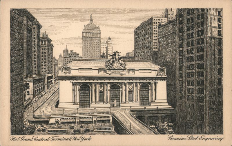 View of the Grand Central Terminal's entrance facade and surrounding cityscape, including elevated roadways and nearby skyscrapers. Rendered as a steel engraving.