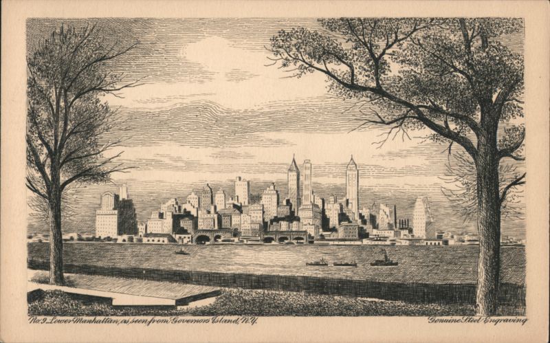 An engraved view of the Lower Manhattan skyline, seen across the water from Governors Island, framed by two large trees. Several boats are on the water.