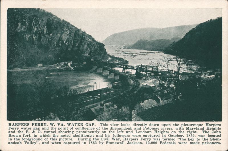 View of the Harpers Ferry water gap at the confluence of the Shenandoah and Potomac rivers, with Maryland Heights and Loudoun Heights visible. Features the B. & O. tunnel and the historical site of John Brown's Fort. Known as "the key to the Shenandoah Valley" during the Civil War, site of Stonewall Jackson's 1862 capture of 12,000 Federal prisoners. |
