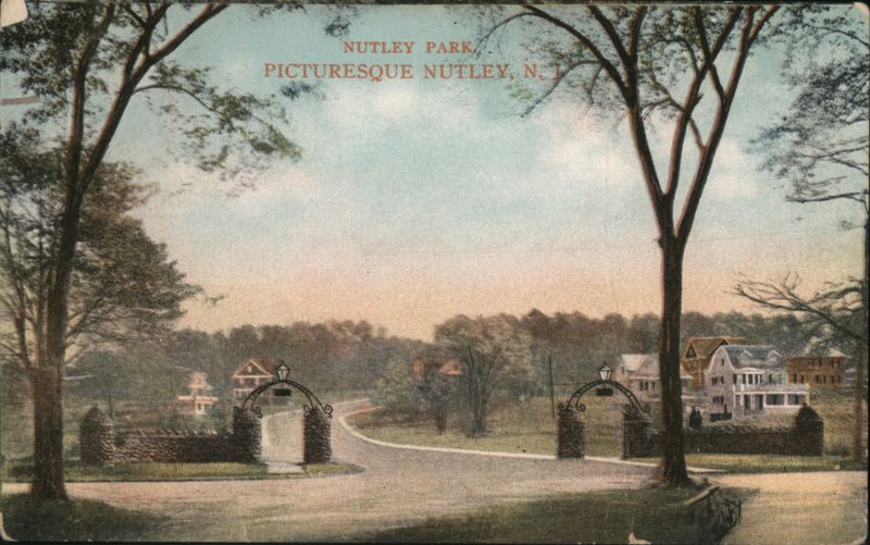 View of the entrance to Nutley Park, featuring two stone and iron gateways framing a winding road. Trees line the path, with residential homes visible in the background, conveying a scenic setting.