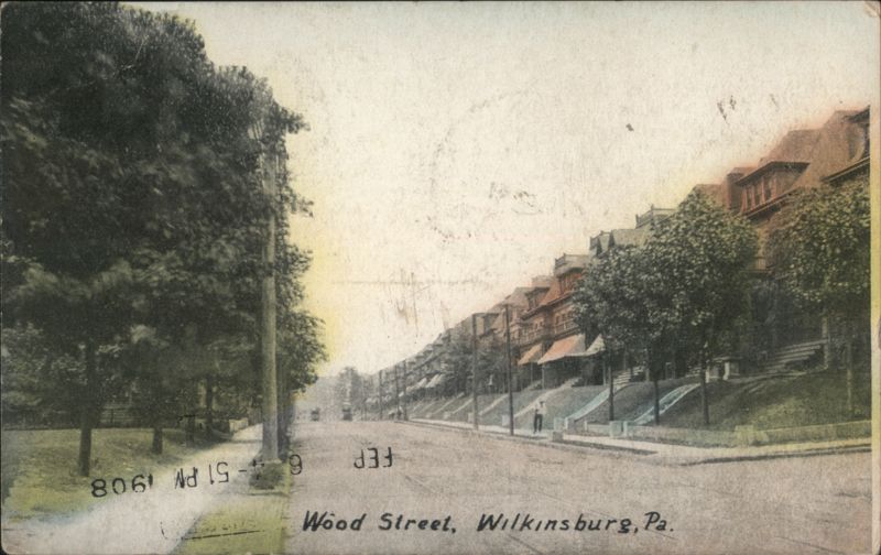 A view of Wood Street lined with houses and mature trees, extending into the distance with a gentle slope.