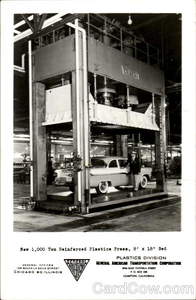 New 1,000 Ton Reinforced Plastics Press, 8' x 18' bed. General offices 135 South La Salle Street Chicago, Illinois. Plastics Division General American transportation Corporation. 2966 East Victoria Street. P.O. Box 228 Compton, California.