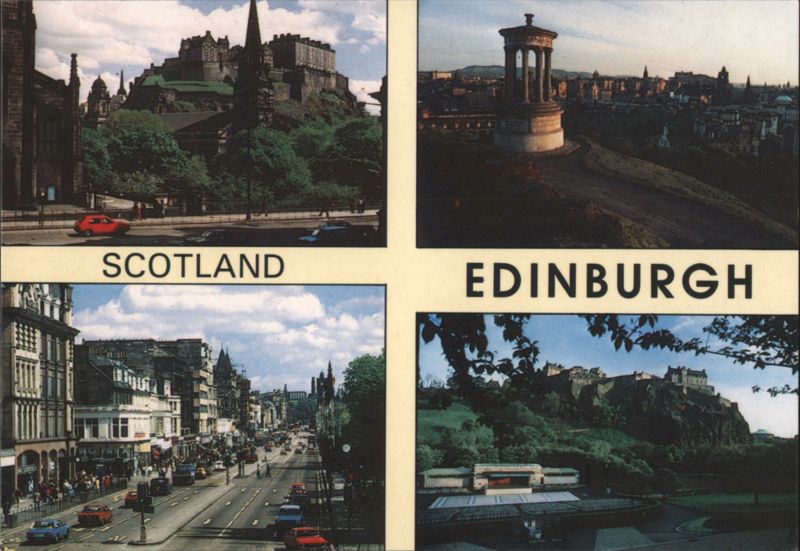 Four views of Edinburgh, Scotland, featuring the iconic Edinburgh Castle, the Dugald Stewart Monument on Calton Hill, a bustling street scene of Princes Street, and a tranquil view of a bandstand in a park.