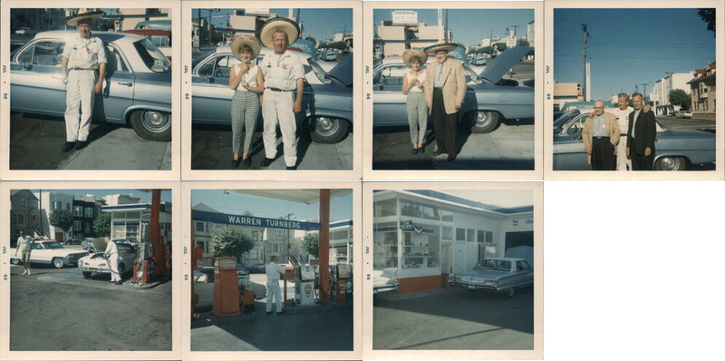 | A series of snapshots depicting a gas station, identified as 'Warren Turnberg', with various people. Some images feature a man and woman wearing sombreros posing with a car, while others show groups of men. The gas station includes pump islands and a service bay. |