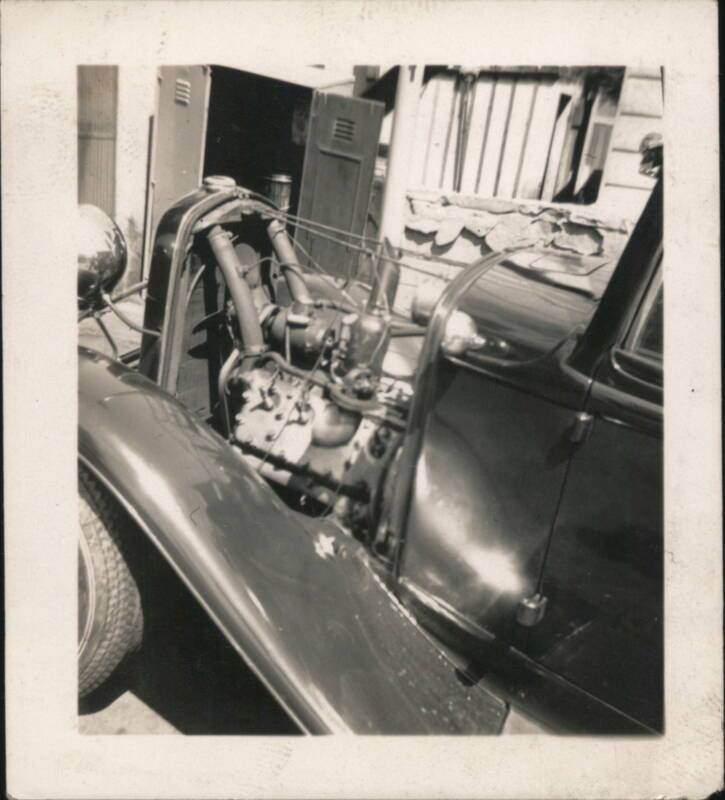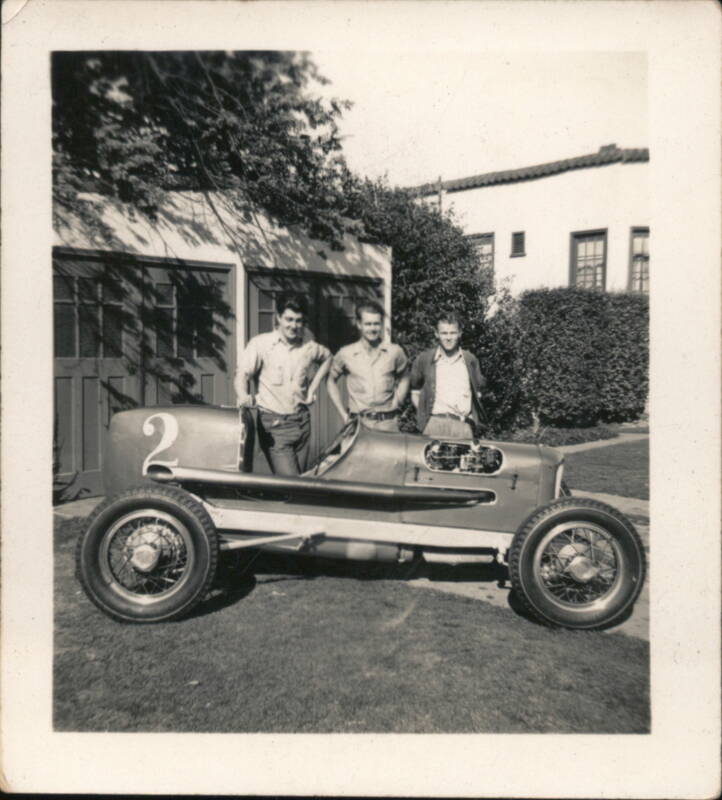 A collection of images featuring various custom-built and open-wheel racing cars, including a roadster and midget racers, with individuals posing alongside them in garage, gas station, and residential settings. Also includes a close-up view of an engine.