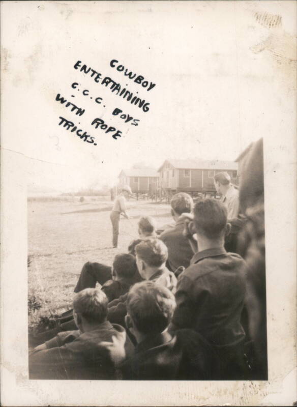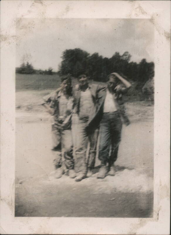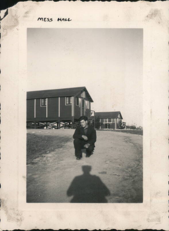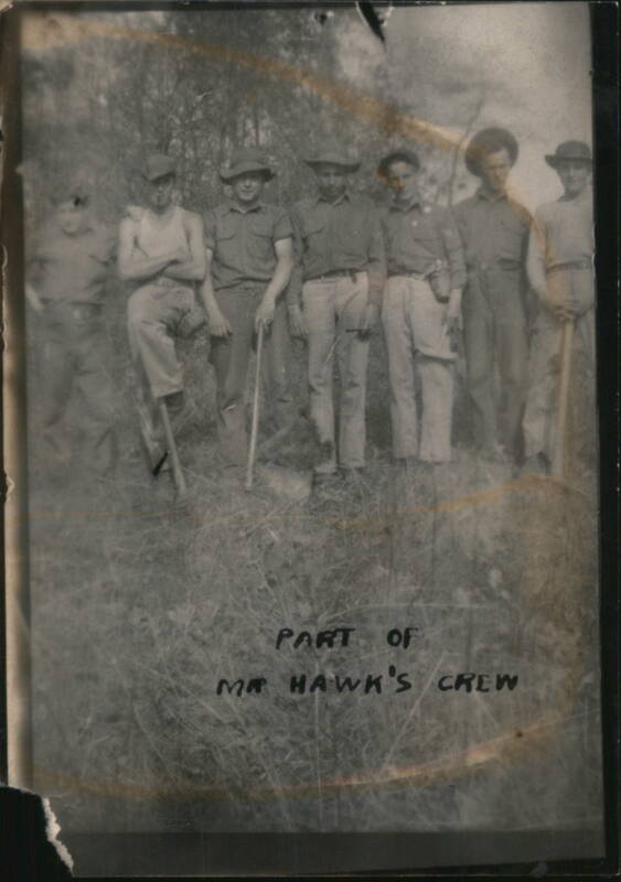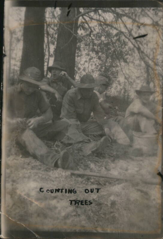 | Various black and white photographs depicting groups of men, some identified as 'Combat Engineers', 'Ed Nash's Crew', and individuals like 'Travis Watson' and 'Bill Waringhouse'. Scenes include 'Alber Twin Camps', 'New Bass Camp', 'Walk at Wakena', 'Prell Hill', and images of trucks, equipment ('Pavis, The Cat'), and general camp life. |