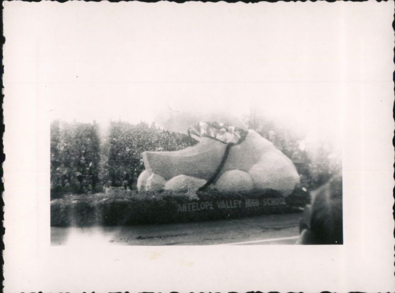 | Six distinct parade floats are depicted, including the 'City of Monterey Park' float featuring a horse-drawn carriage, the 'Antelope Valley High School' float with large sculpted figures, and a 'Glendora' float with people on horseback. Other floats include an ornate Asian-themed design and a jungle scene with a giraffe. |