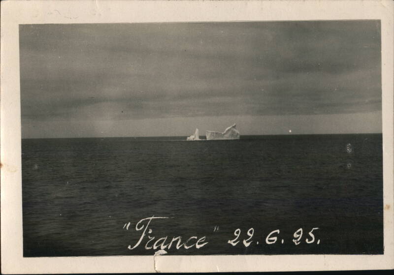 A large iceberg with distinct peaks and valleys floats in the open sea under an overcast sky. The image was taken from the ship 'France' on June 22, 1925.