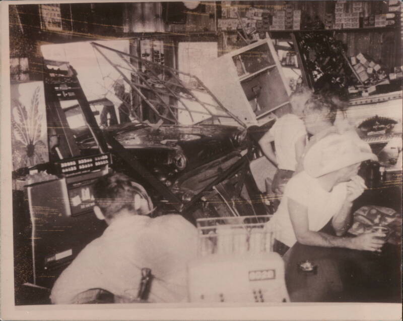 Left side shows a messy interior, possibly a bar or diner, with overturned furniture and debris. Right side shows a 1957 Chevrolet Bel Air hitting the side of a building, with a person standing near the impact point.