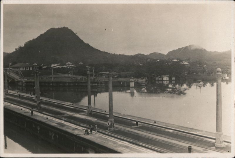 View of the Panama Canal locks with water in the foreground, showing the lock mechanism and surrounding infrastructure. Hills and residential buildings are visible in the background.