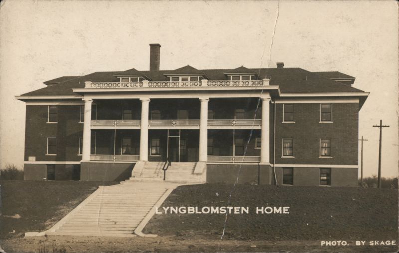 A large, two-story brick building featuring a grand white porch with columns and a second-story balcony. A long set of stairs leads up to the main entrance. A tall chimney is visible on the roof. Utility poles and lines are visible on the right side. |