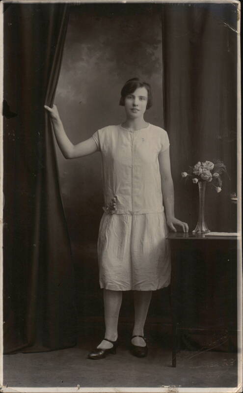 Full-length portrait of a young woman with short hair wearing a light-colored flapper-style dress, posing by a dark curtain and a table with a vase of flowers.