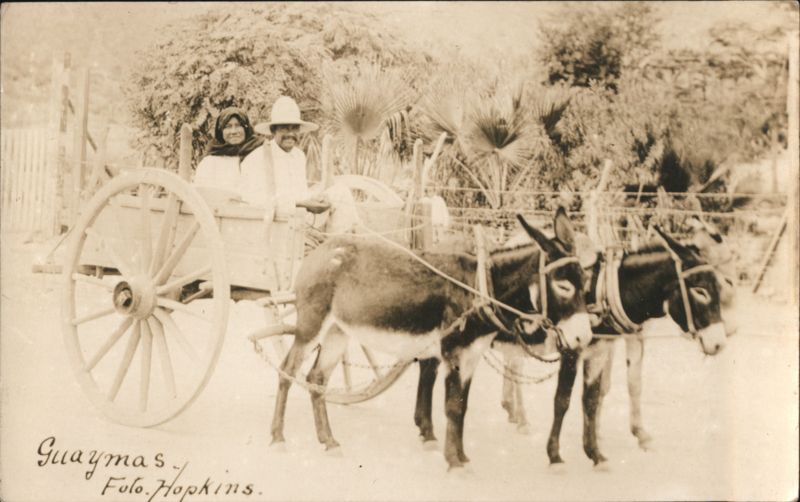 A couple, with the man wearing a sombrero, seated in a spoked wooden cart pulled by two donkeys. The scene is set against a backdrop of lush foliage and palm trees.
