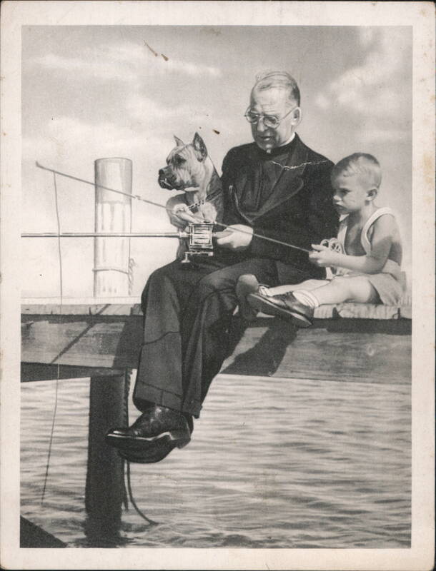 A snapshot of clergyman Father Flanagan fishing on a pier with a young boy and a dog. The image is described as symbolizing his life, work, and interest in boyhood, and was taken shortly before his death. Father Wegner offers an 8x10 inch enlargement of the image. |