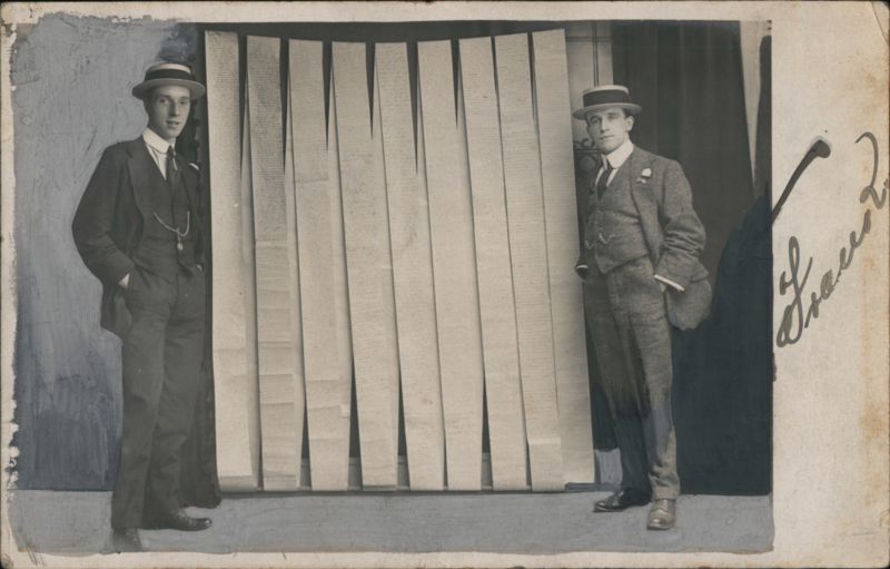| Two men pose for a portrait. The man on the left wears a dark suit with a visible pocket watch chain, while the man on the right wears a textured suit with a boutonnière. Both sport light-colored fedoras. They stand before a backdrop of vertical panels resembling newspaper columns. |
