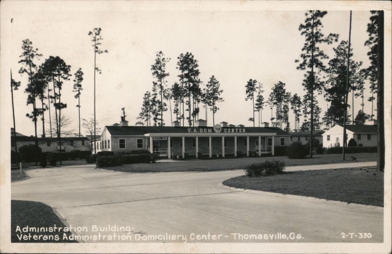 Front view of the single-story Administration Building at the Veterans Administration Domiciliary Center, featuring a covered porch with columns.