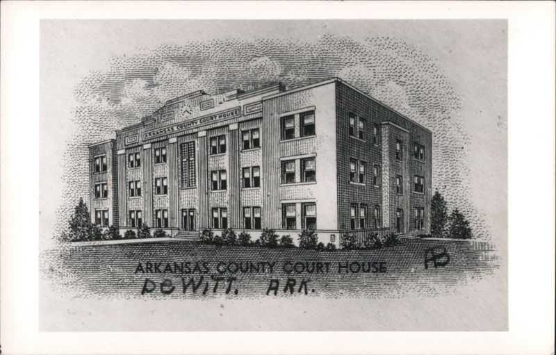 A detailed drawing of the Arkansas County Court House building, set on a landscaped lawn with trees on either side.