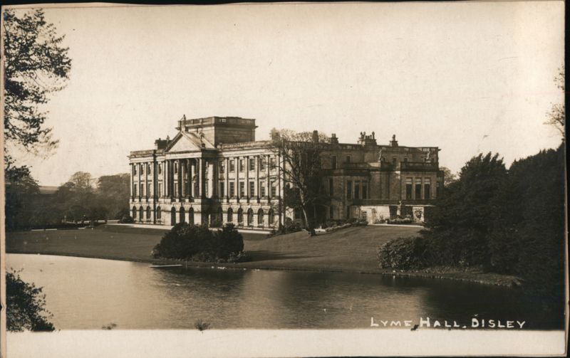 A view of the grand stately home, Lyme Hall, situated on a large estate with a lake in the foreground and extensive lawns and trees.