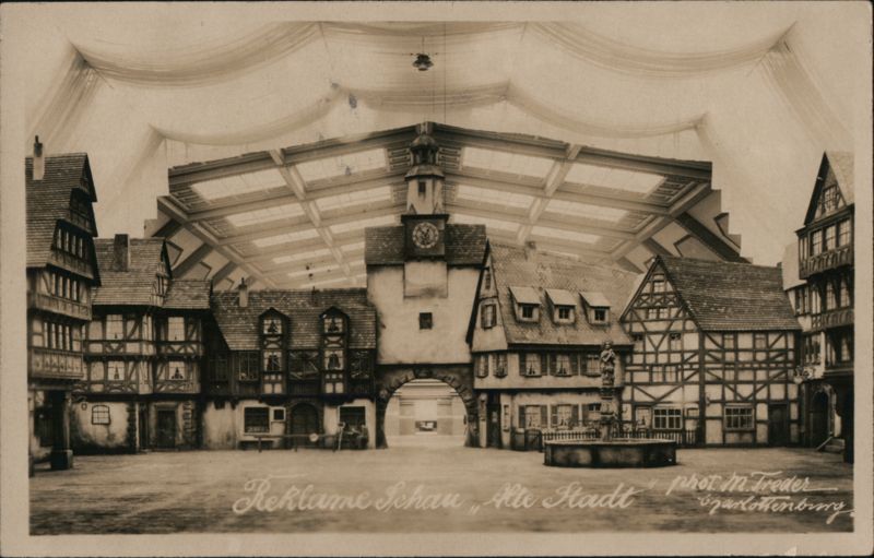 An indoor exhibition scene depicting a staged 'old city' with traditional half-timbered houses, a central gate with a clock tower, and a fountain in the foreground. The structural elements of the exhibition hall roof are visible above.