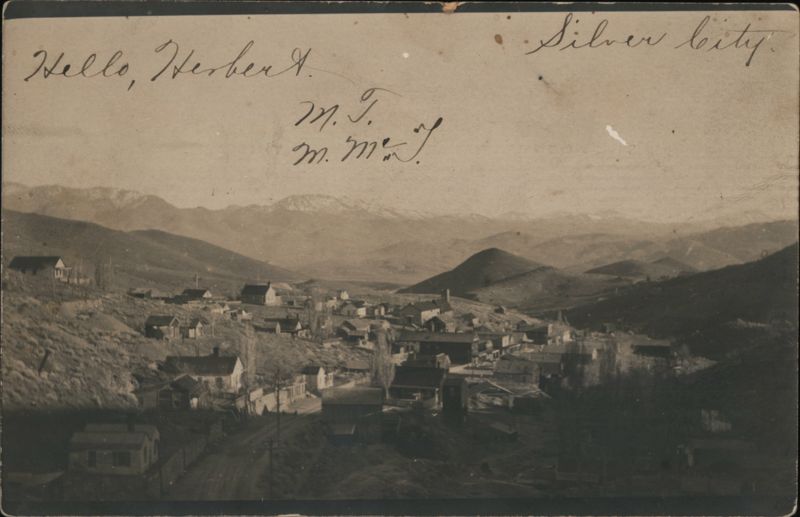 A panoramic view of Silver City, a mining town nestled in a valley, with houses scattered across hillsides and mountains in the distance.