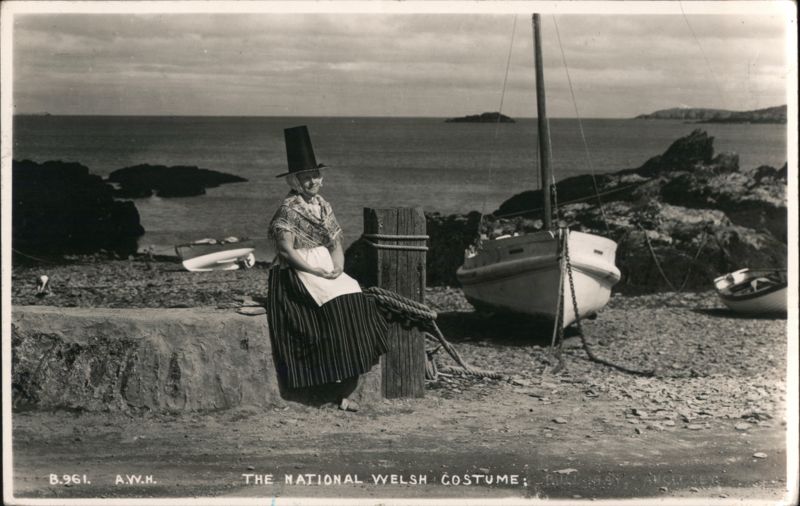 A woman in traditional Welsh attire, including a tall black hat and a shawl, sits on a low stone wall by the sea. Fishing boats are visible on the water and shore with a rocky coastline in the background.