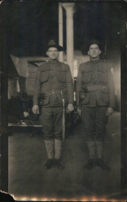 Two uniformed soldiers stand side-by-side indoors, one wearing a broad-brimmed campaign hat and the other bareheaded.