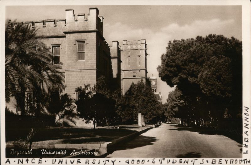 Campus view of the American University of Beirut, featuring its stone buildings, palm trees, and a pathway. The university had 4000 students.