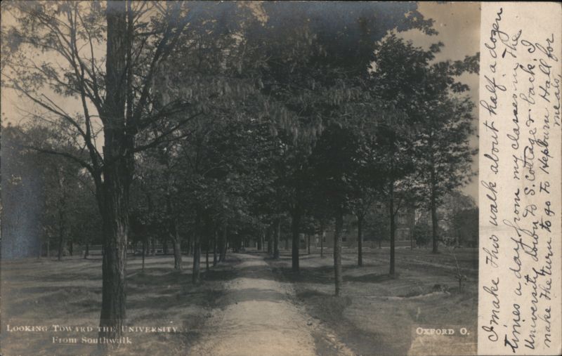 A path winds through a densely tree-lined avenue, leading toward the University. The sender notes making this walk 'half a dozen times a day' from classes in The University, down to S. Cottages, and back to Hepburn Hall for meals. The sender also mentions being hired at Oxford and Emma's School. |