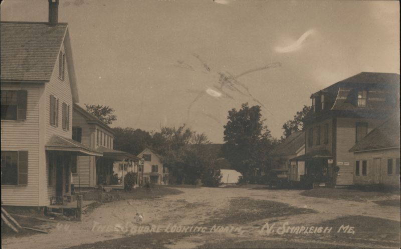 View of a village square with dirt paths, surrounded by several multi-story wooden houses and trees in the background.