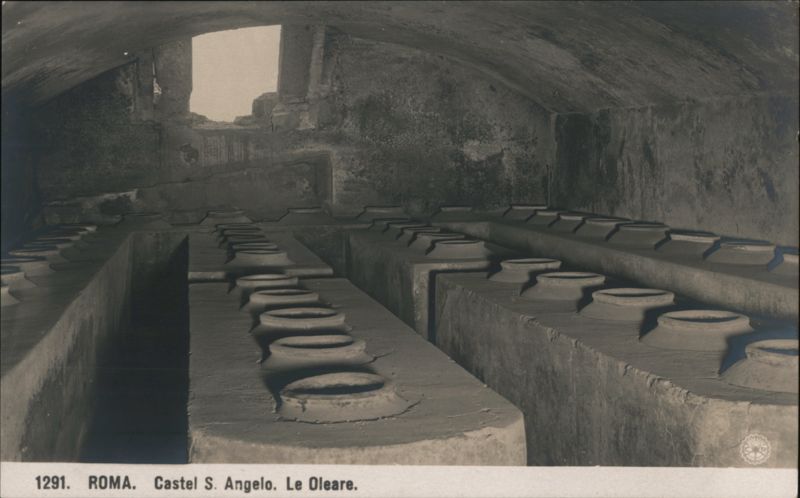 Interior view of a large, vaulted room within Castel Sant'Angelo, featuring numerous rows of large, round-mouthed containers or jars, likely for storing oil or provisions.